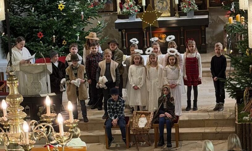 Seit einigen Jahren führen Kinder der Michaelschule Tinnen zu Heiligabend im Rahmen einer kleinen Feier ein Krippenspiel in der Marienkirche auf. Insgesamt zwanzig Schülerinnen und Schüler beteiligten sich in diesem Jahr. Sehr anschaulich erzählten und spielten sie die beschwerliche Reise von Maria und Josef nach Bethlehem, die verzweifelte Suche nach einer Unterkunft, die Geburt Jesu, das Erscheinen der Engel auf dem Hirtenfelde und den Besuch der Hirten an der Krippe. Ergänzt wurde die kindgerechte Darbietung durch Solo-Gesangseinlagen sowie durch einige bekannte Weihnachtslieder, die gemeinsam mit allen Besucherinnen und Besuchern gesungen wurden. Das Krippenspiel stellte eine gelungene Einstimmung auf das Weihnachtsfest dar.